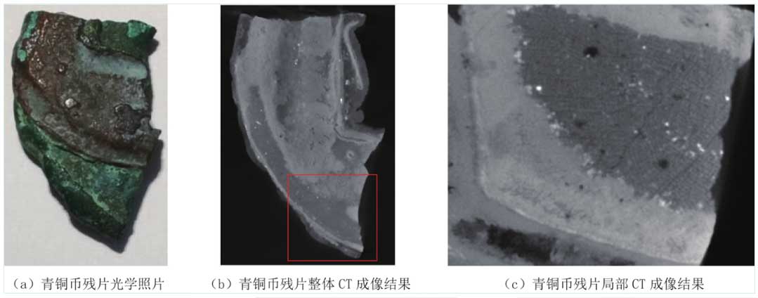 为了验证基于CT图像的青铜器腐蚀病害分层的正确性,本文在不同仪器设备上尝试包括CT成像在内的多种检测手段,检测样品为青铜硬币(样品3)残片(图4(a))。分别对青铜硬币残片进行整体CT成像和局部高分辨率CT,高分辨扫描的体素尺寸为2.9 μm,实验结果如图4(b)和图4(c)所示。