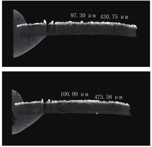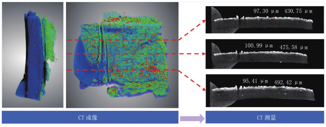 将水凝胶放在旋转轴的中心,采集CT图像。小样本可以获得更高的分辨率。参数设置如表1。然后通过2001张投影图像重建三维CT图像。扫描结果如图12所示。利用Dragonfly软件处理CT结果。从切片图像可以看到水凝胶和有害锈迹之间的边界。图像中明亮的区域是有害锈层,有孔隙的区域是水凝胶层。最后,我们选择了多张不同的切片图像,并在Dragonfly软件中测量了水凝胶层和有害锈层。红线测量有害锈层的深度,绿线测量水凝胶的厚度。根据测量结果,水凝胶层的厚度约为400~500 μm。水凝胶去除有害锈的深度约为90~100 μm。