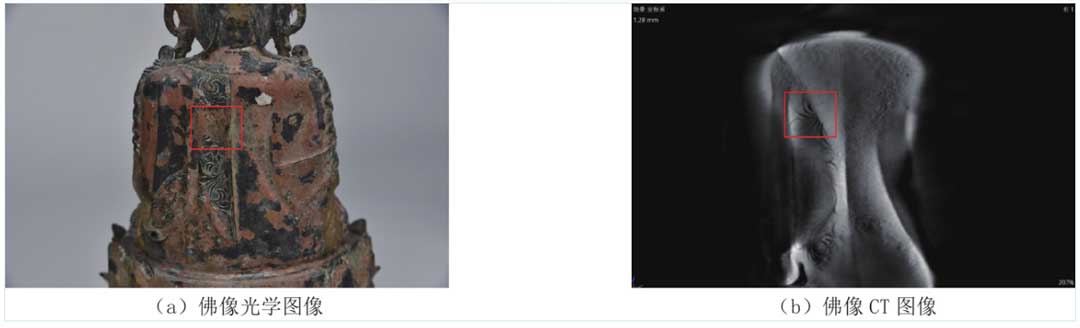图3所示为青铜器佛像的局部成像对比图。左边是带有彩绘和贴金装饰的佛像光学图像,可以看到局部金箔和彩绘脱落处露出部分铜佛像表面的不完整衣饰脉络细节。右边是佛像CT图像,可清晰展现未脱落彩绘金箔区下青铜佛像衣饰铸造细节(红框内)。