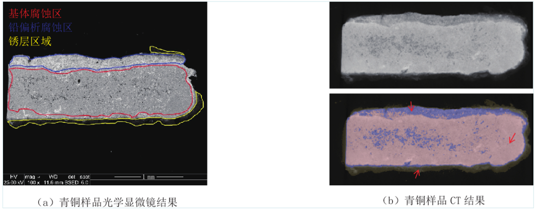 对青铜器(样品4)进行取样,然后在光学显微镜下对其进行成像和分析,如图8红色区域为基体腐蚀区,蓝色区域为铅偏析腐蚀区,黄色区域为锈层区域。再对同一样品进行CT成像,找到CT图像中相应的位置,可以明显看出,光学显微镜中划分出的区域,在CT图像中均能找到对应的腐蚀区,红色区域为基体腐蚀区,蓝色区域为铅偏析腐蚀区,黄色区域为锈层区域。相比光学显微镜的结果,CT结果的灰度值、对比度等方面,均要优于光学显微镜。